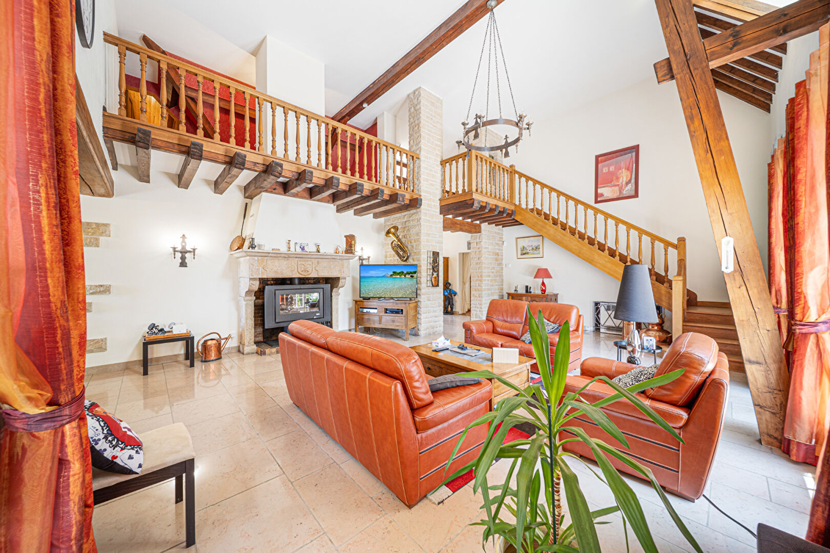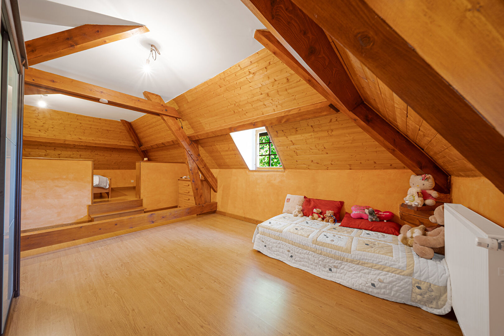À l'étage, une mezzanine dessert quatre chambres, une salle d'eau, un second toilette.