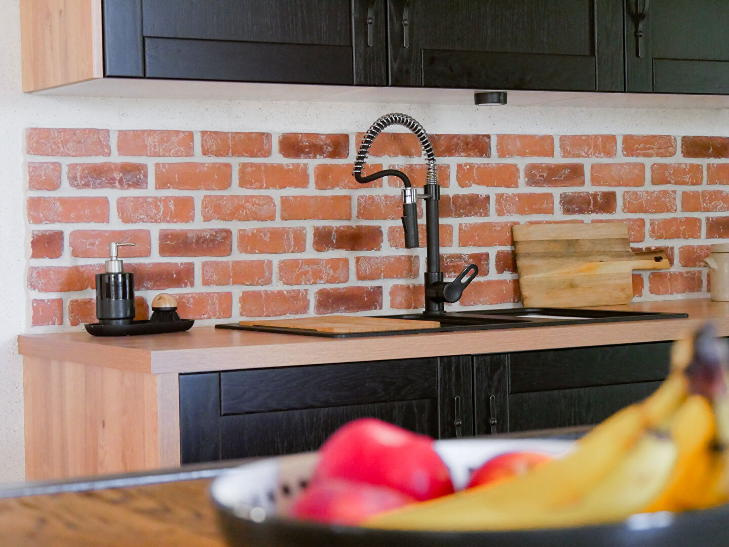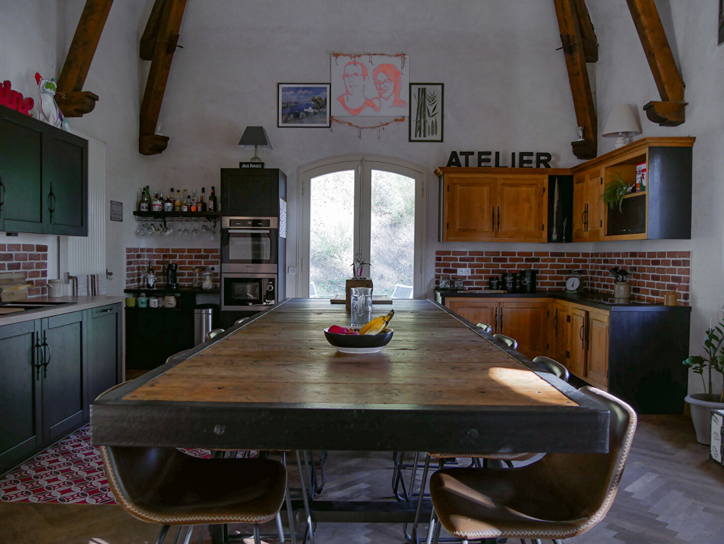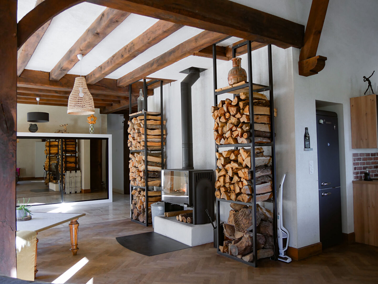 La cuisine aménagée et équipée, conviviale et fonctionnelle, s'intègre harmonieusement à cet espace de réception agrémenté d'un poêle à granulés.